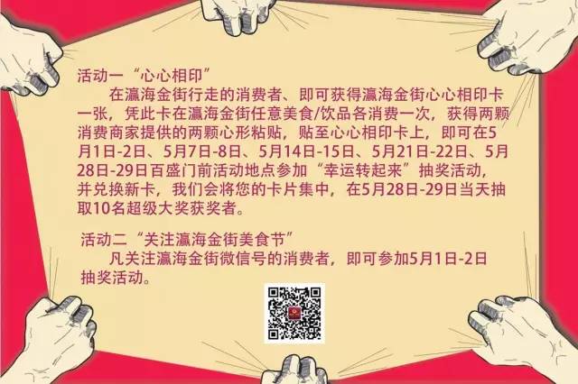在灜海金街行走的消費(fèi)者、即可獲得灜海金街心心相印卡一張,憑此卡在灜海金街任意美食/飲品各消費(fèi)一次,獲得兩顆消費(fèi)商家提供的兩枚粘貼,貼至心心相印卡上,即可在5月1日-2日、5月7日-8日、5月14日-15日、5月21日-22日、5月28日-29日百盛門前活動地點(diǎn)參加“幸運(yùn)轉(zhuǎn)起來”抽獎活動,并兌換新卡,我們會將您的卡片集中,在5月28日-29日當(dāng)天抽取10名超級大獎獲獎?wù)摺?/p>